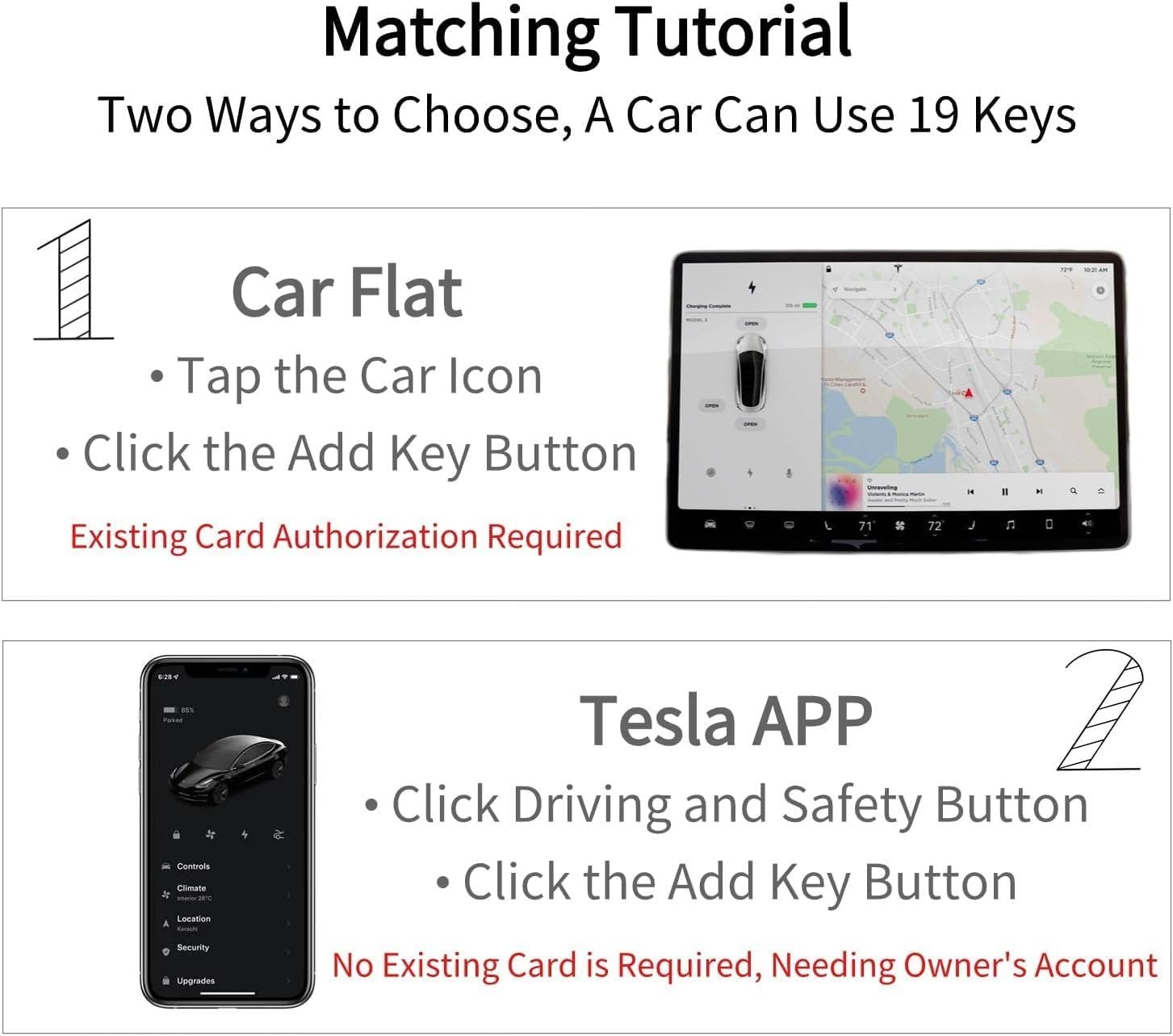 Genuine Tesla Key cards, brand new not ever programmed. Your Model 3/Model Y comes with two key cards and one bifold wallet for easy entry, operation and transport. Key cards are convenient for when your phone is not accessible, out of battery, or if someone else needs temporary access, such as a valet. To lock or unlock, tap your key card on the center of the pillar to the right of the driver’s window. To start your Model 3/Model Y, tap your key card behind the cup holders and place your foot on the brake pedal to start. Note: Access cannot be granted from the passenger side of the vehicle. Programming is easy – Tap the Car Icon –> General If you do not have an existing key card, you will need to visit a service center to reprogram.
